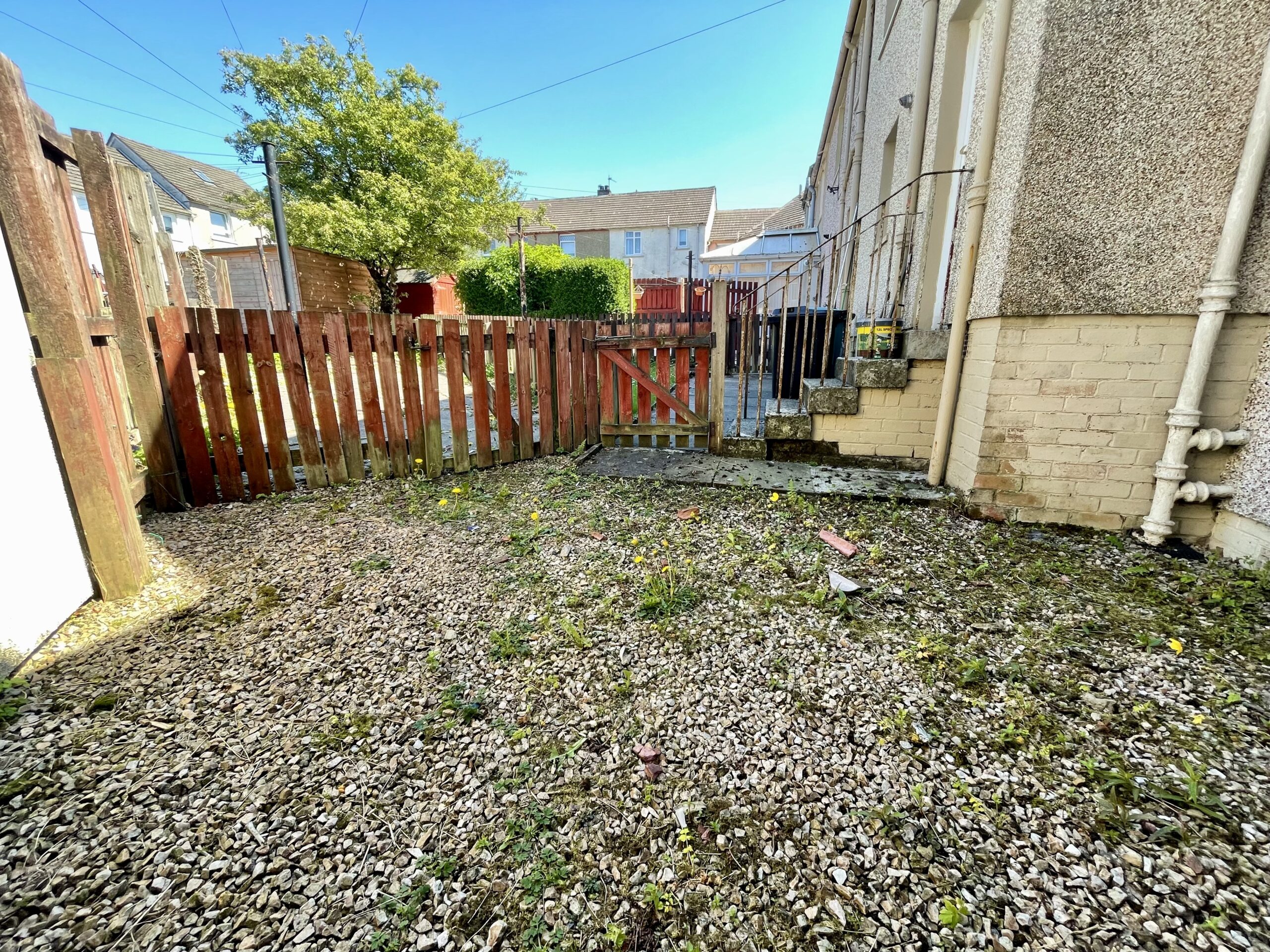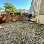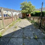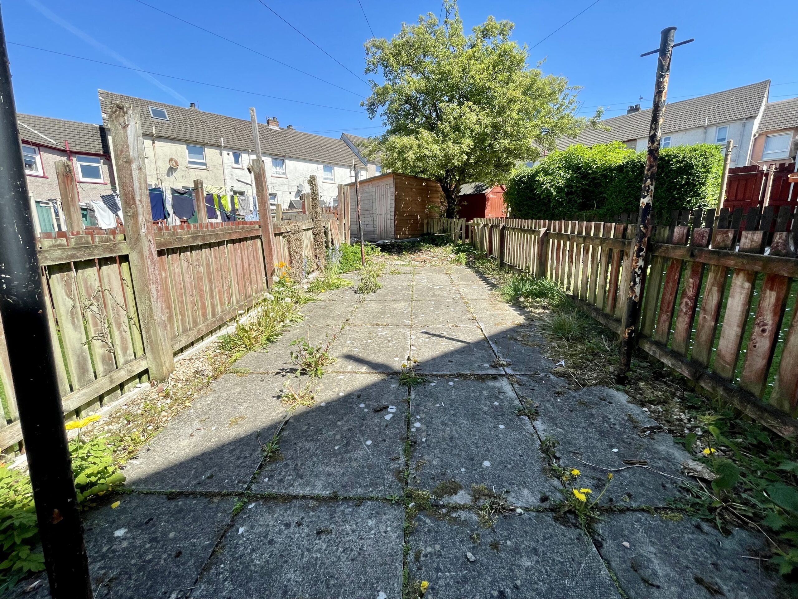 Rear Garden is paved with lawn, patio and shed.