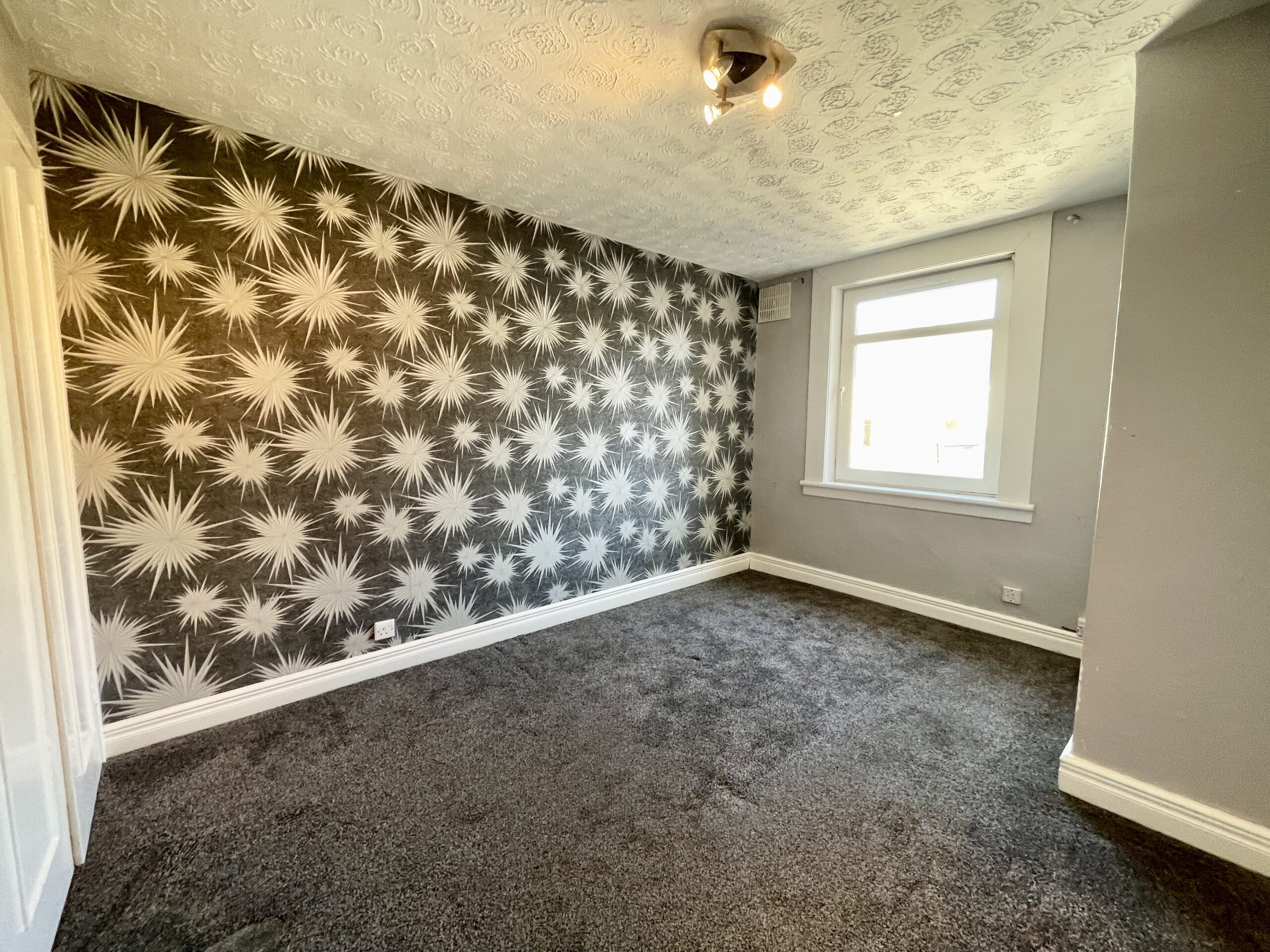 Window to rear, feature lighting, double storage cupboard and carpeted flooring. Access to inner hallway.