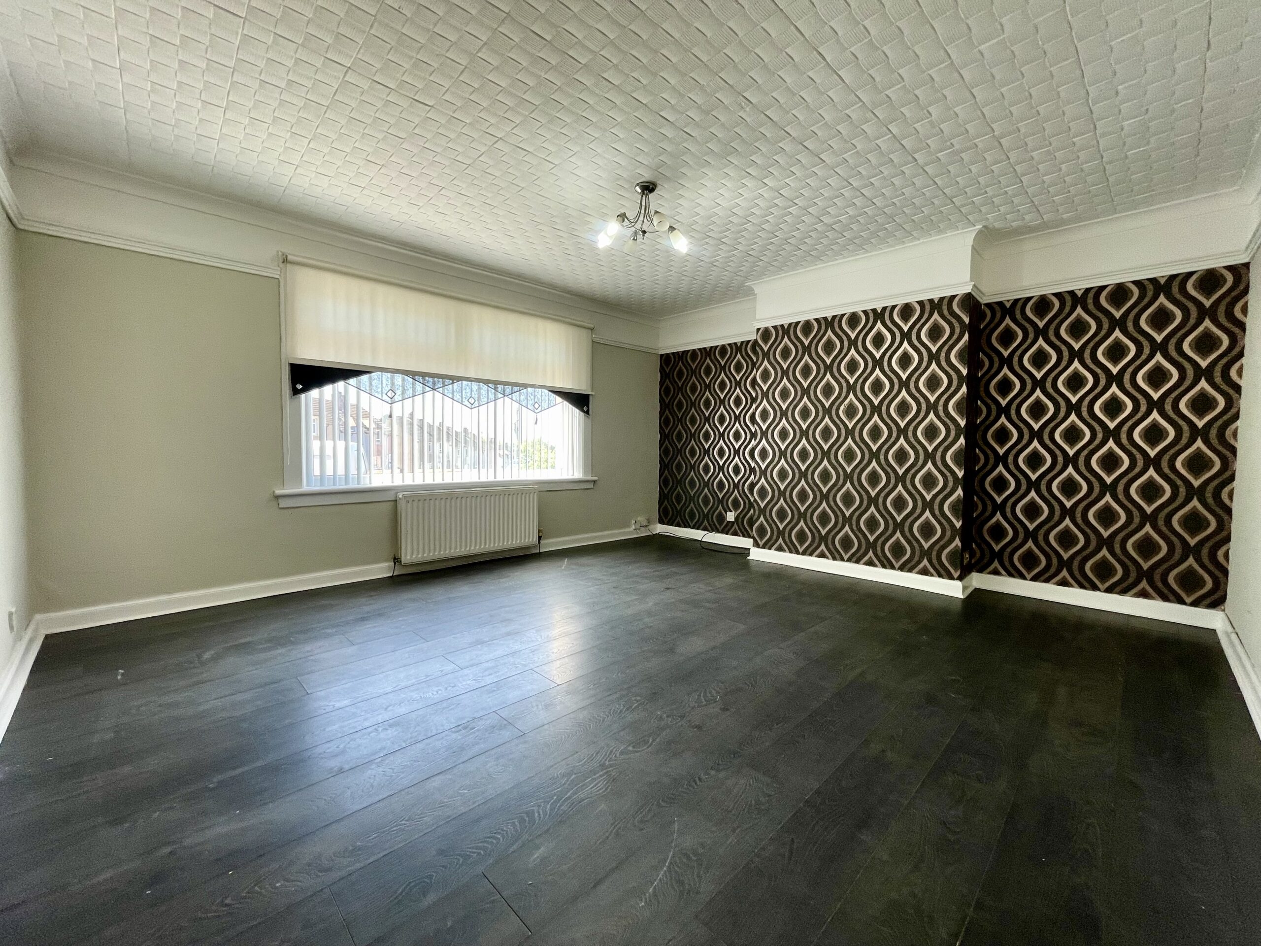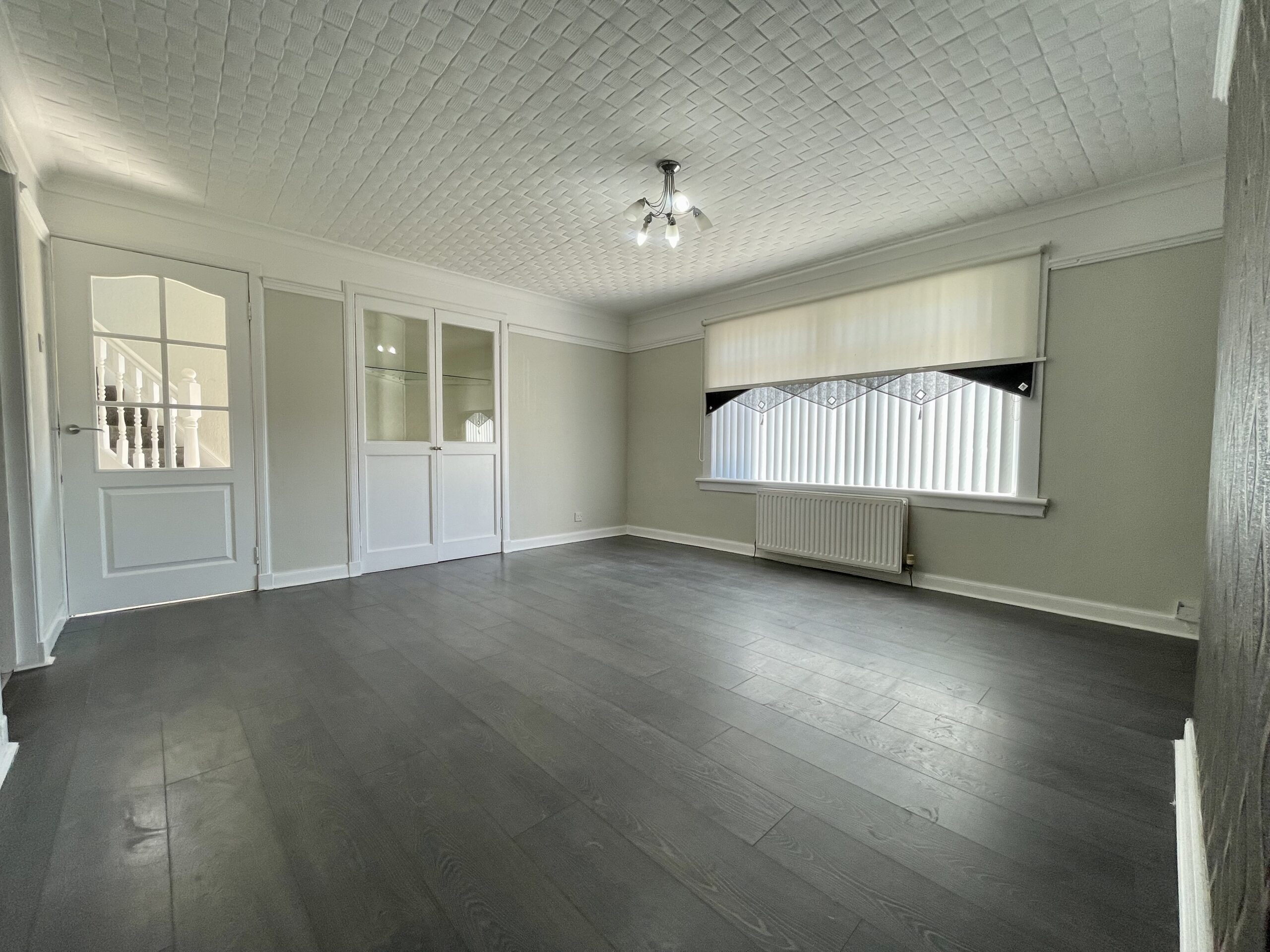 Window to front, laminate flooring and feature lighting. Access to kitchen and inner hallway.