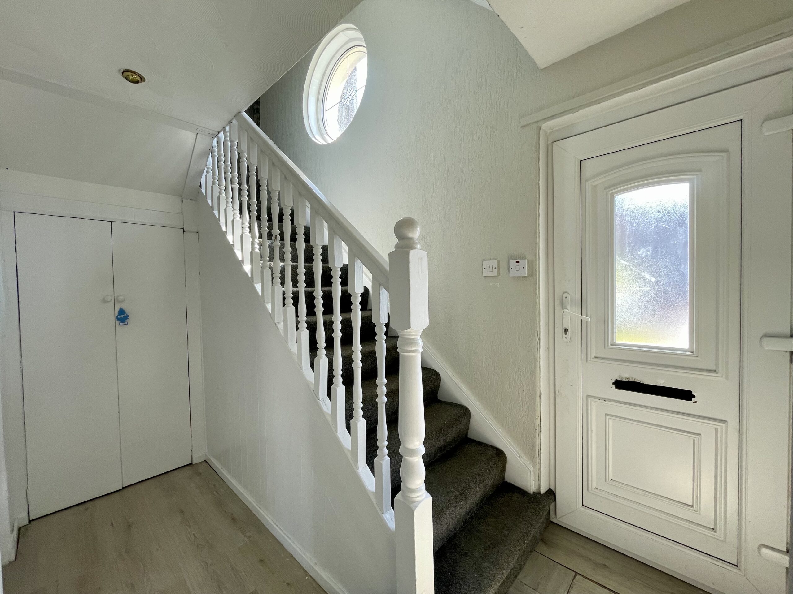 Laminate flooring, window to front, recess lighting, double storage cupboard and carpeted staircase giving access to upper apartments. Access to lounge and family bathroom.