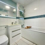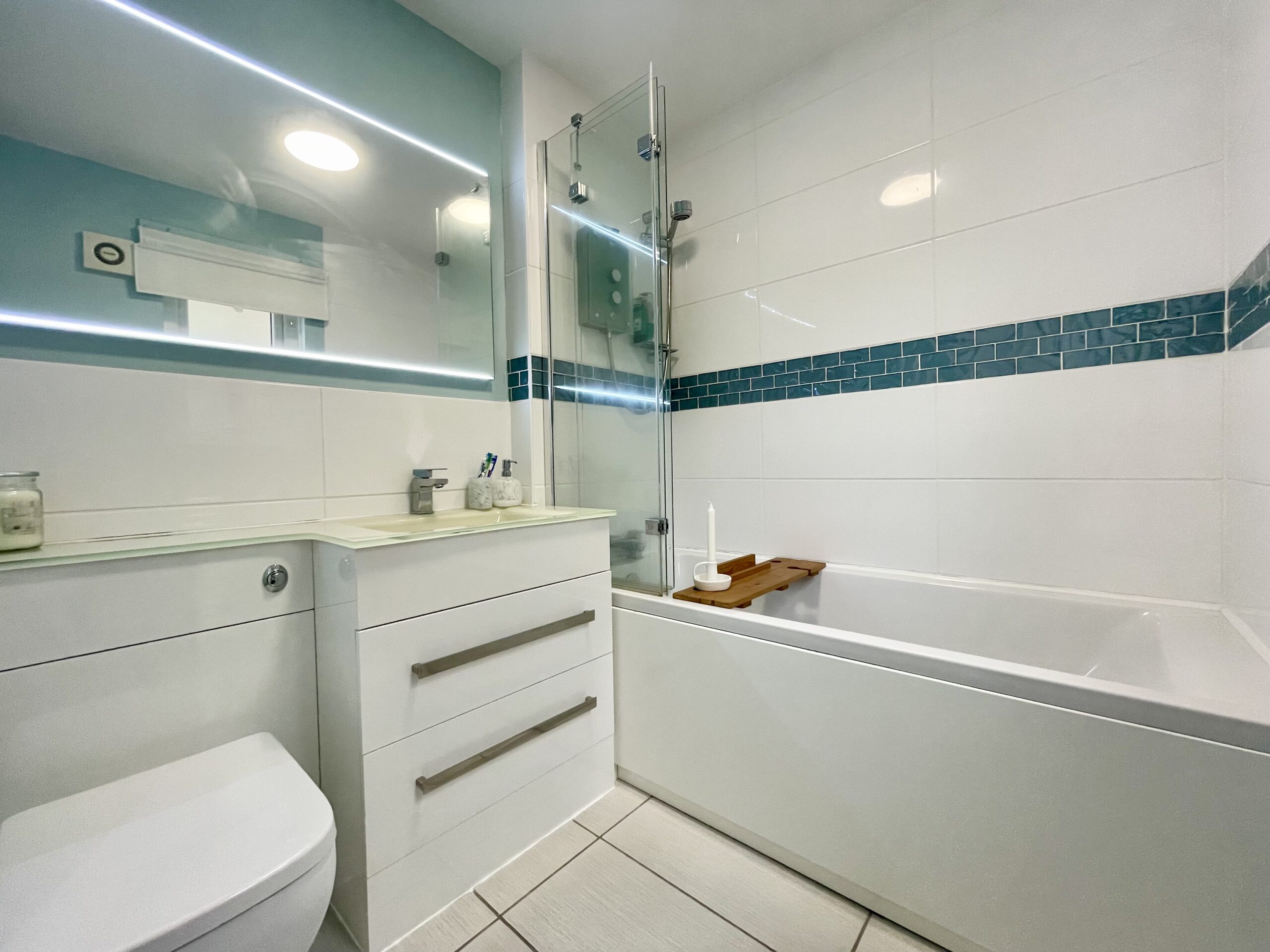 Three piece white sanitary suite, electric shower over bath with glass screen, tiled flooring, recess lighting, vanity storage, heated towel rail and window to side.