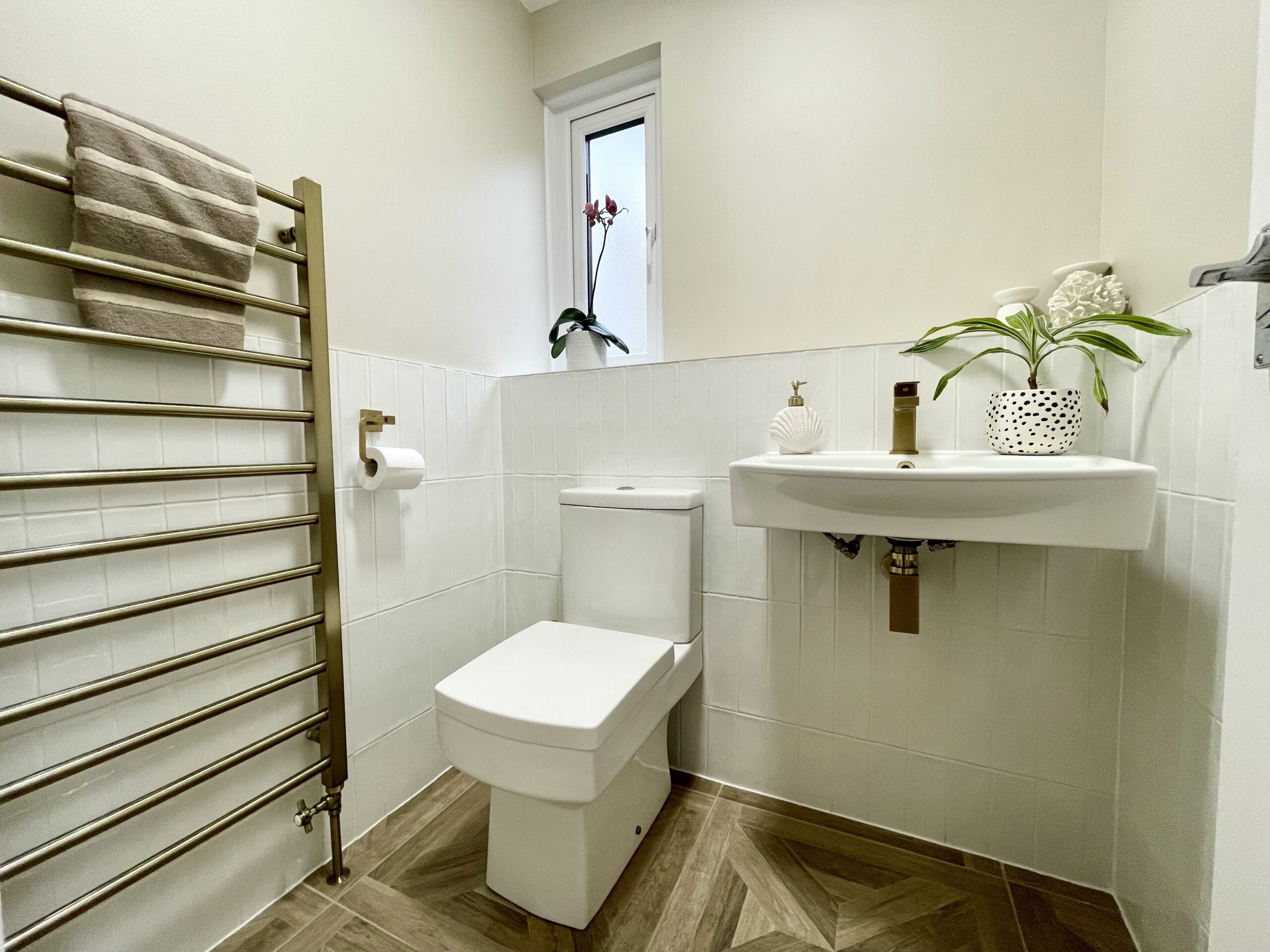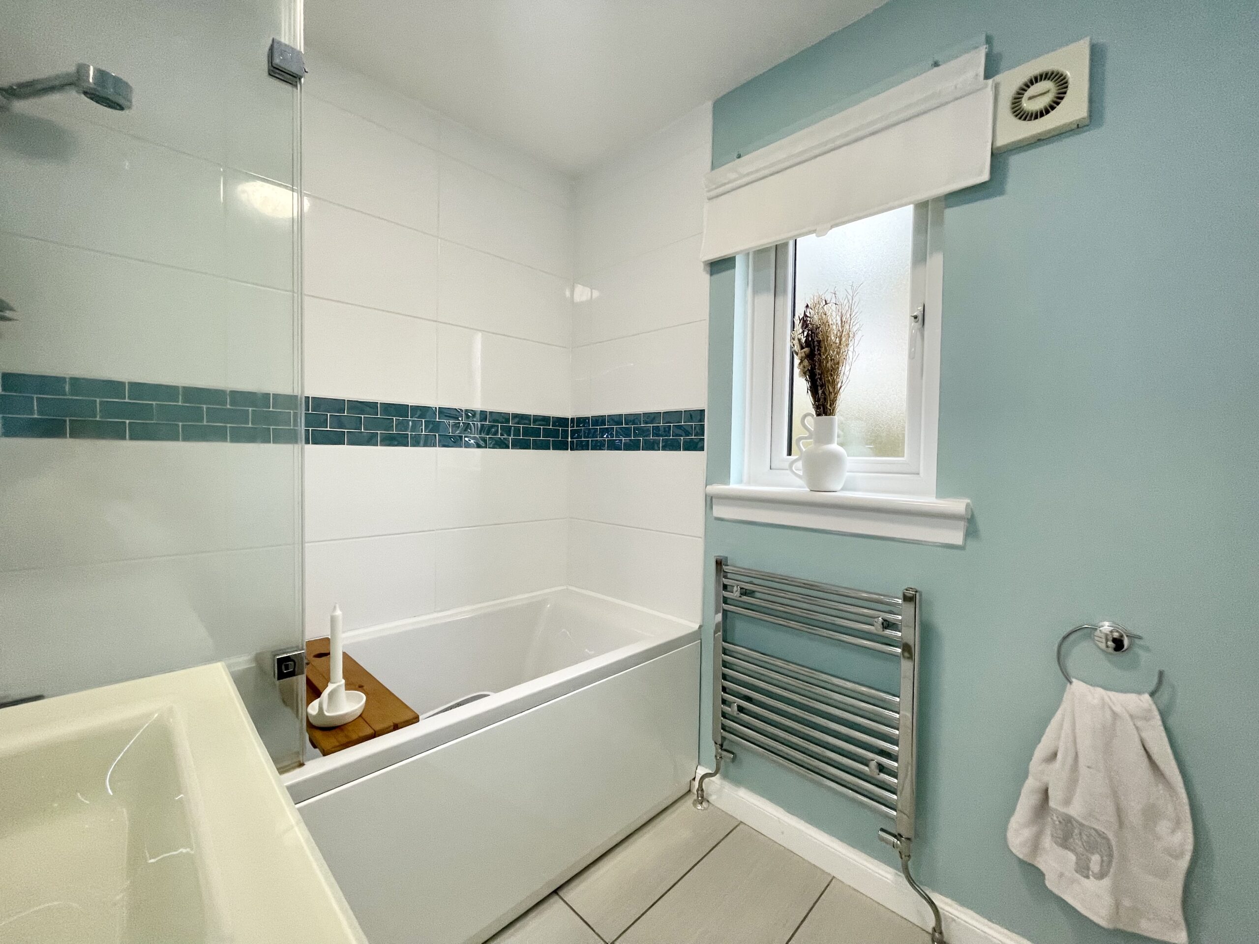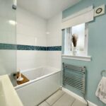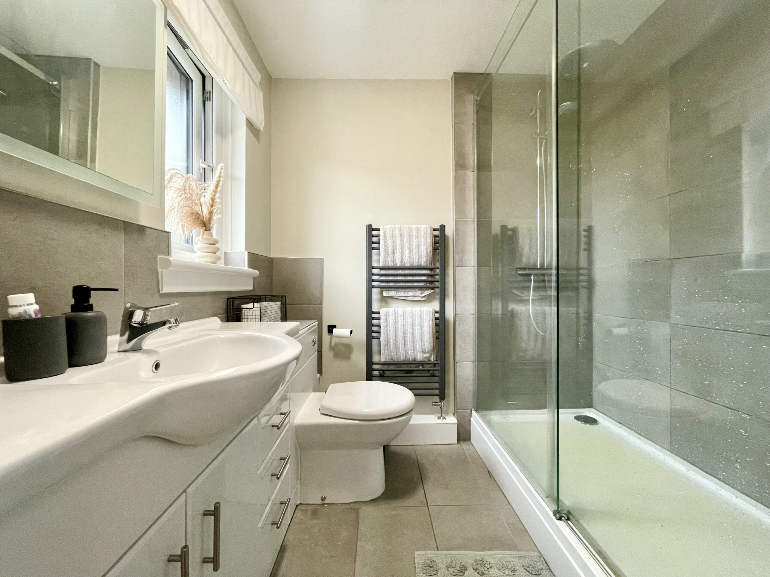 Tiled flooring, heated towel rail, window to side and feature lighting.