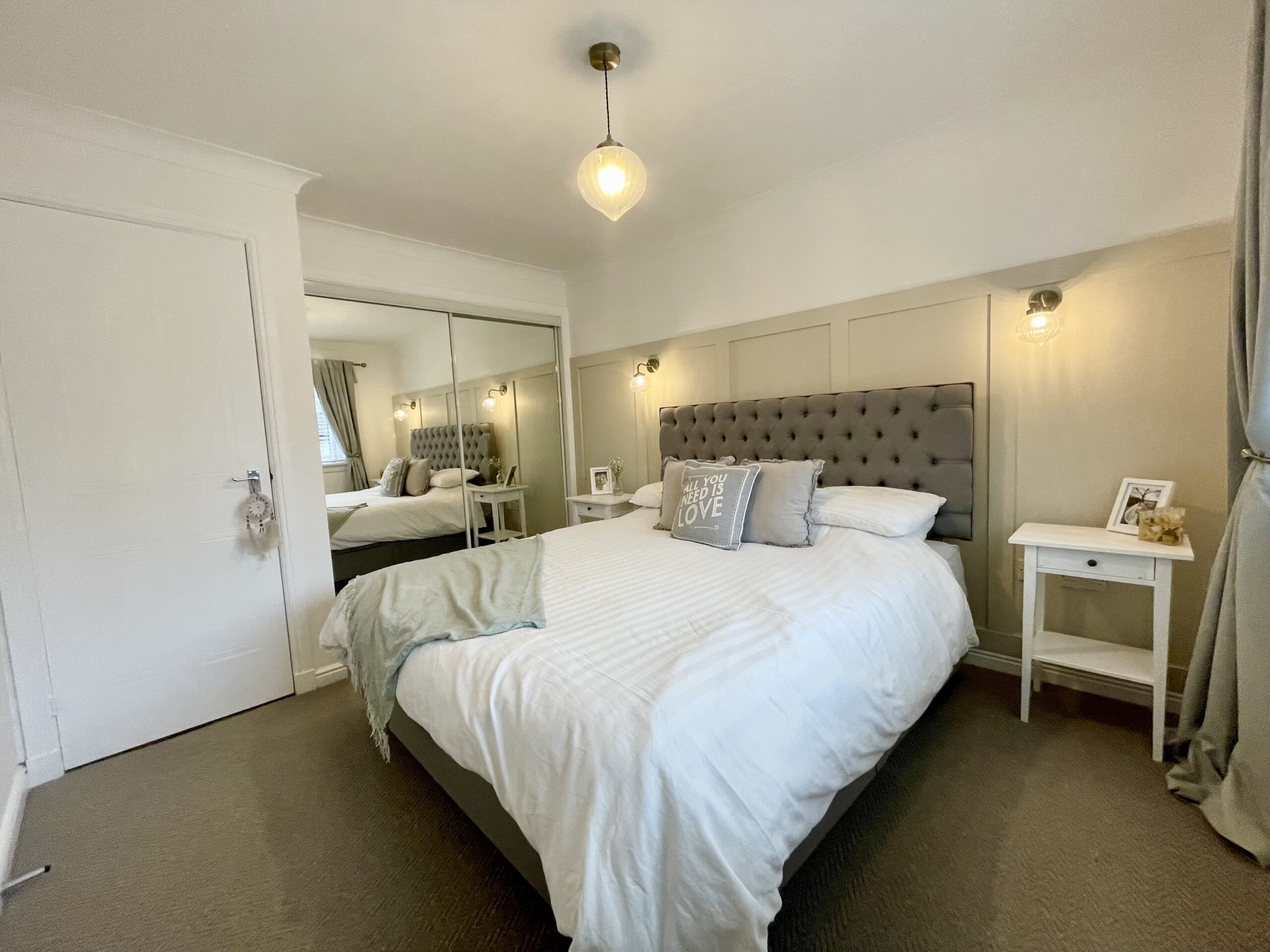 Substantial master bedroom with window to rear, carpeted flooring, feature and wall lighting, double fitted mirrored wardrobes and access to the en-suite and inner hallway.