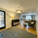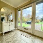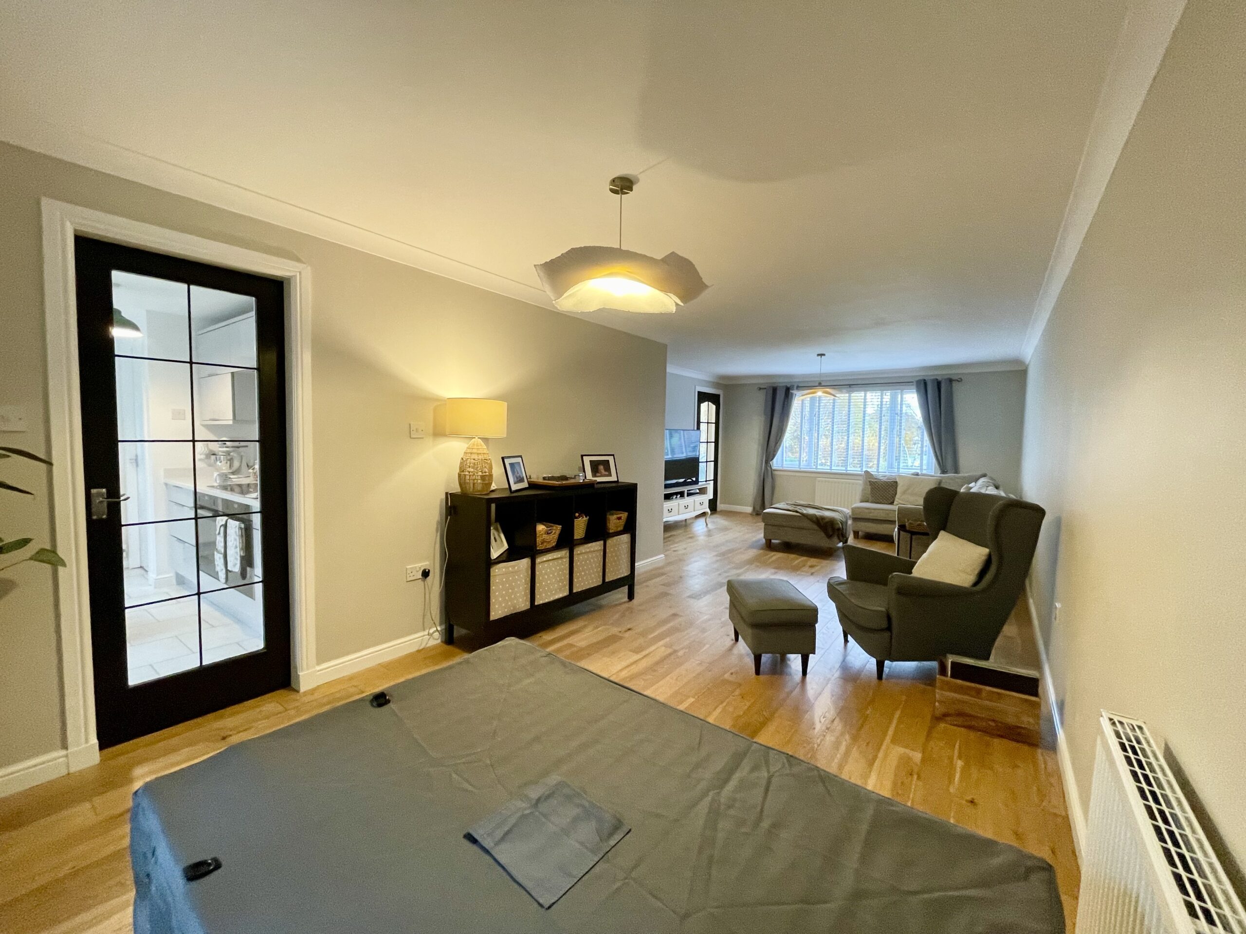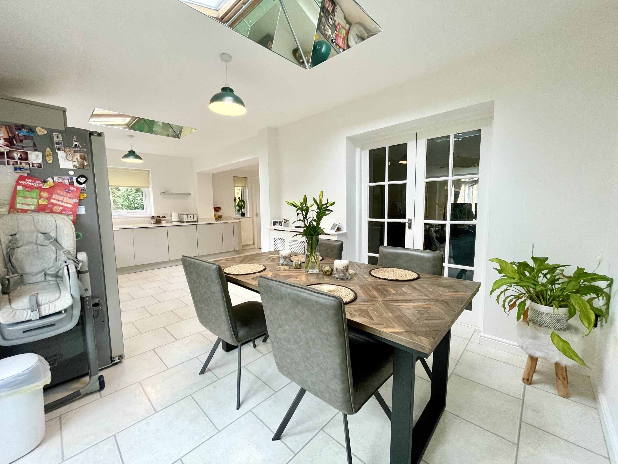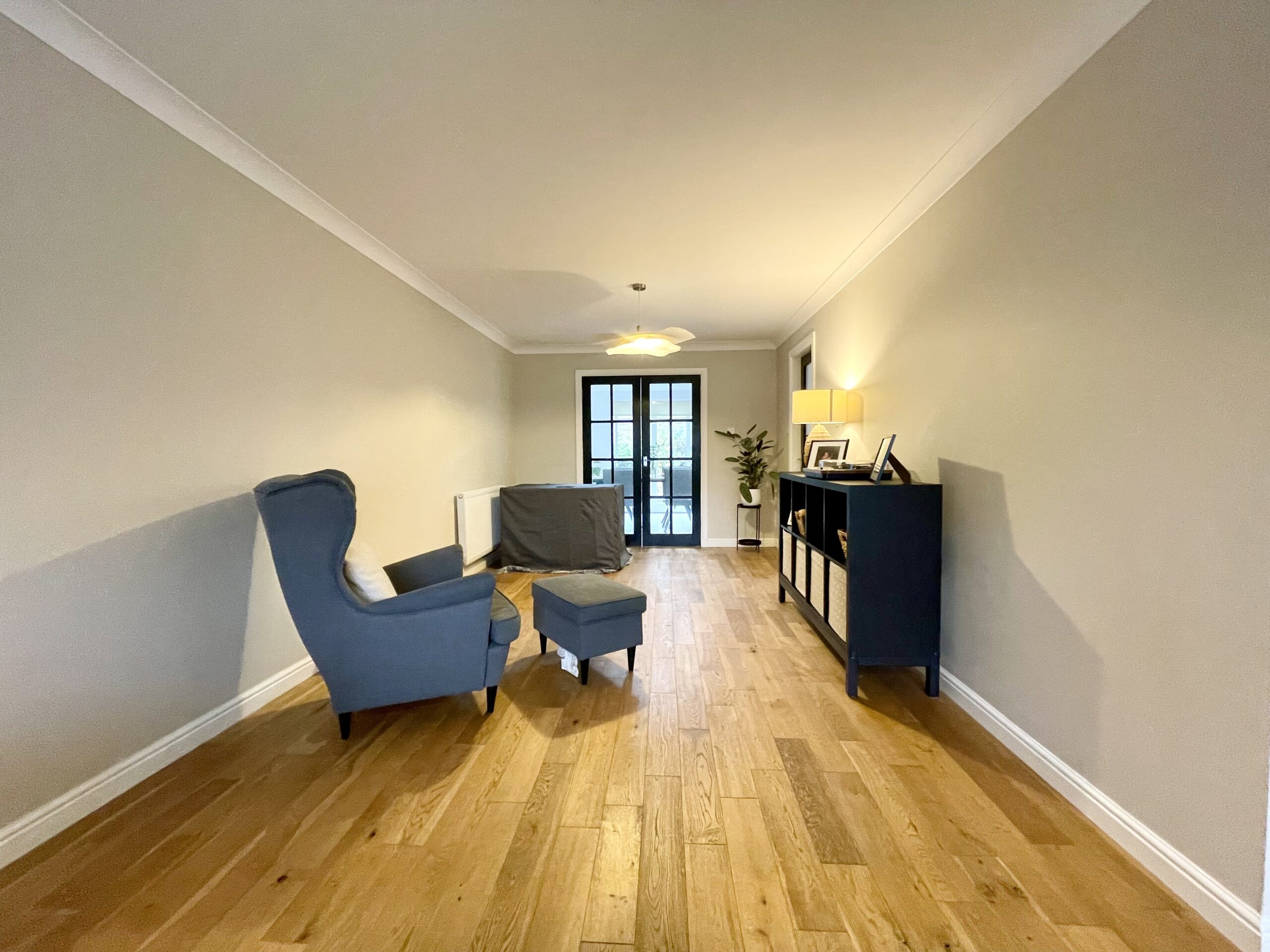 The family area is spacious with laminate flooring and feature lighting, Open plan family seating area which has French doors accessing the patio and gardens with a further set of French doors accessing dining room and lounge.