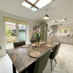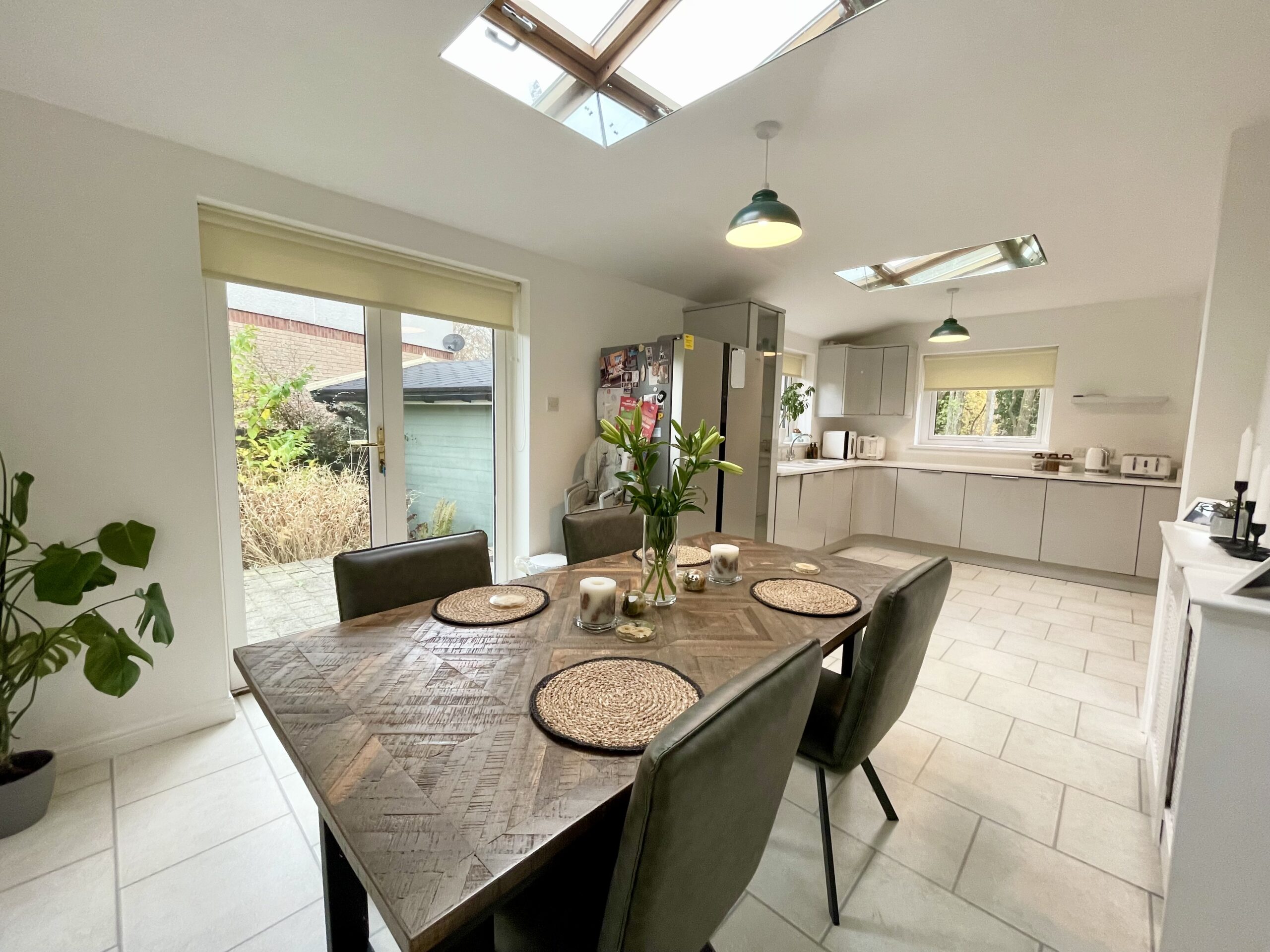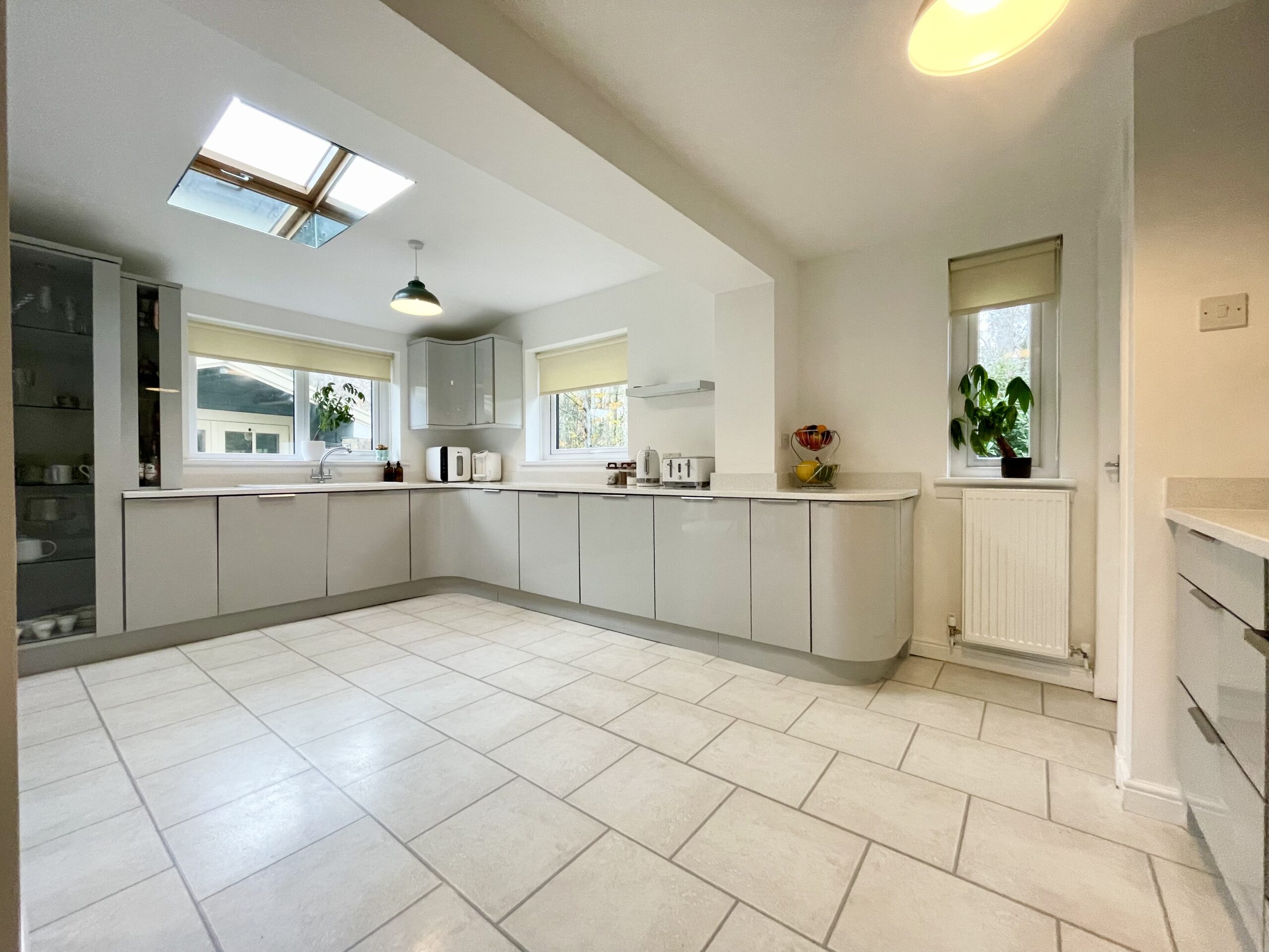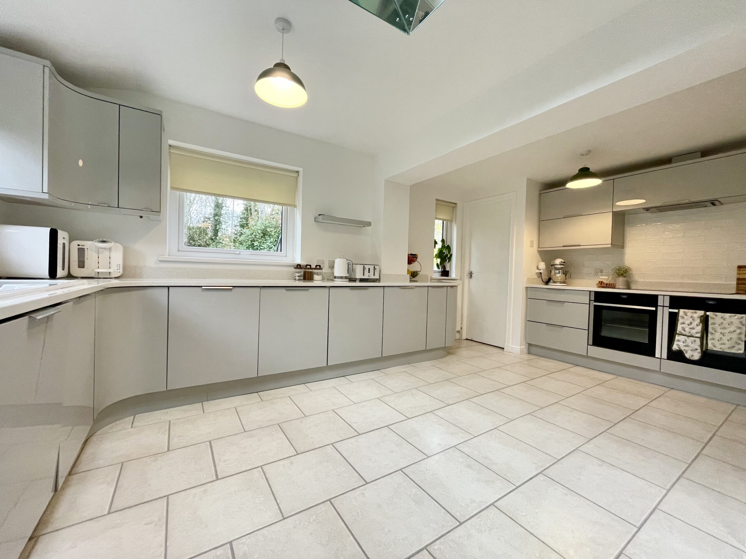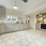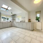 A spacious and bright dining kitchen with ample floor/wall units and contrasting Quartz worktops containing sink with mixer tap. Integrated appliances including electric hob, double electric oven, extractor fan, fridge, freezer, dishwasher, feature lighting, laminate flooring, window to rear and two windows to side, two velux skylight windows. Breakfasting dining area. Door accessing utility room.