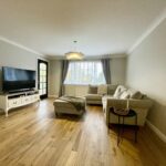 A welcoming family lounge with feature windows to front of the property flooding this room with natural light and overlooking stunning landscaped gardens, real wood flooring, electric fire and fireplace and feature lighting. French doors accessing family room and door accessing kitchen.