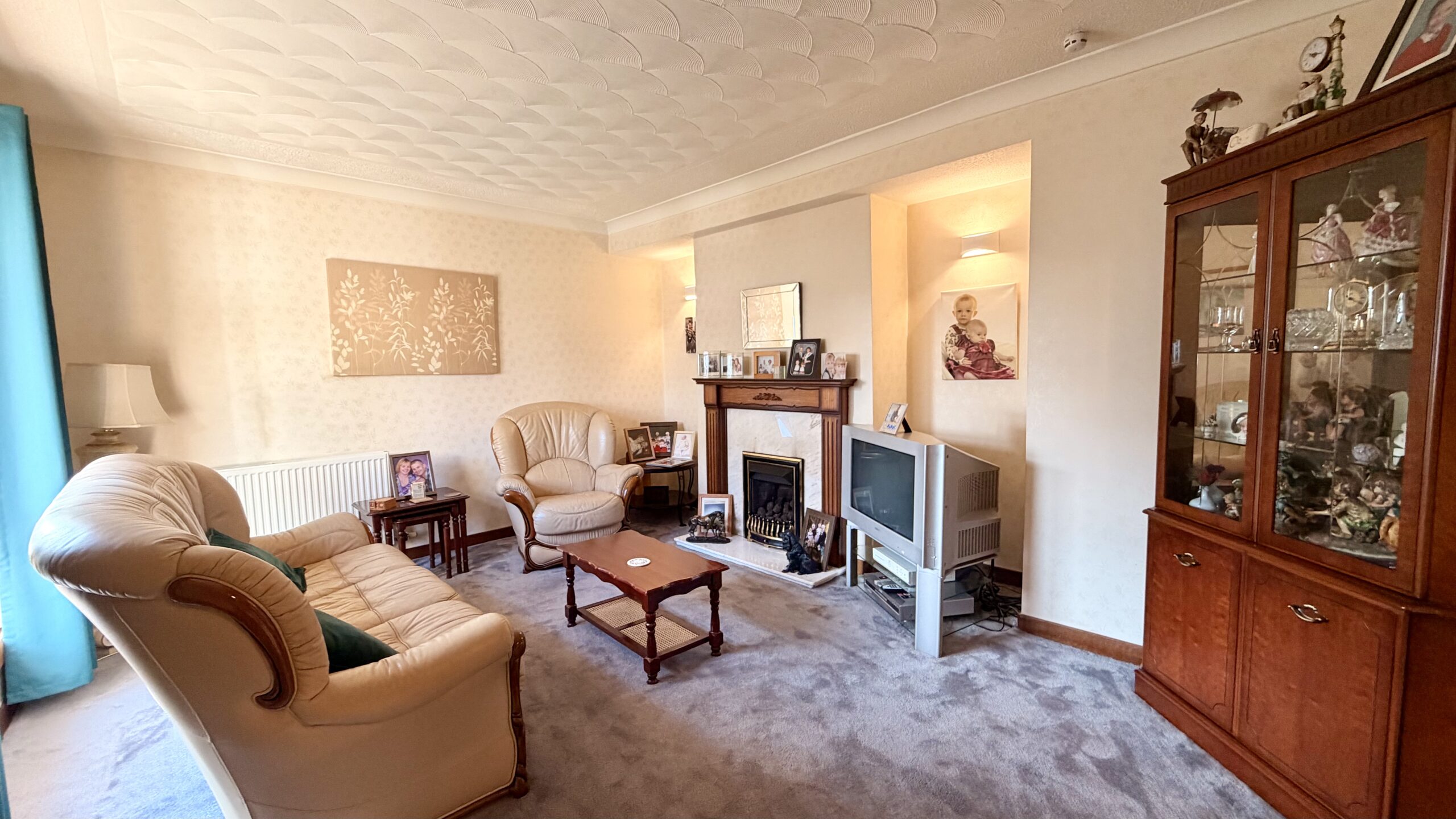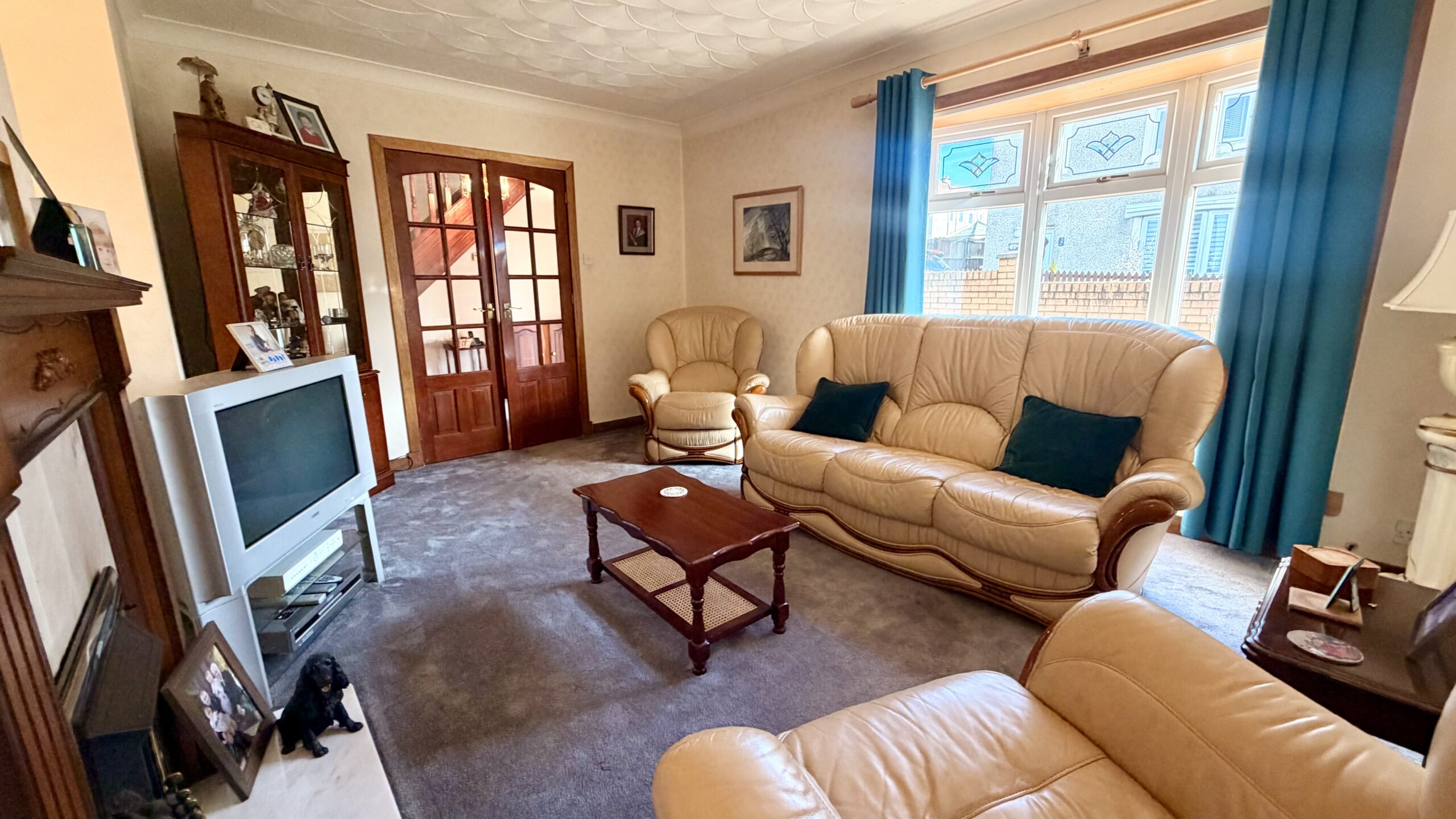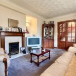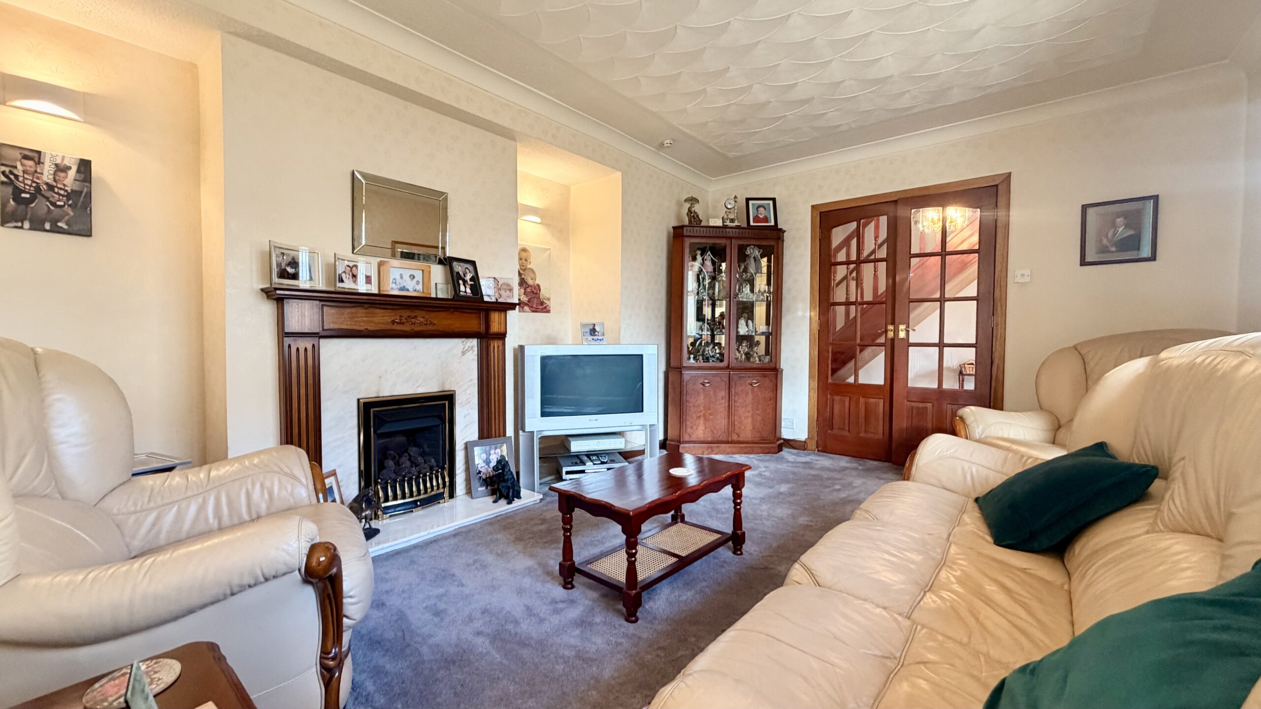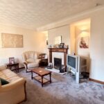 Spacious lounge with bay window to front, carpeted flooring, living flame gas fire with fireplace and feature lighting. French doors giving access to inner hallway.