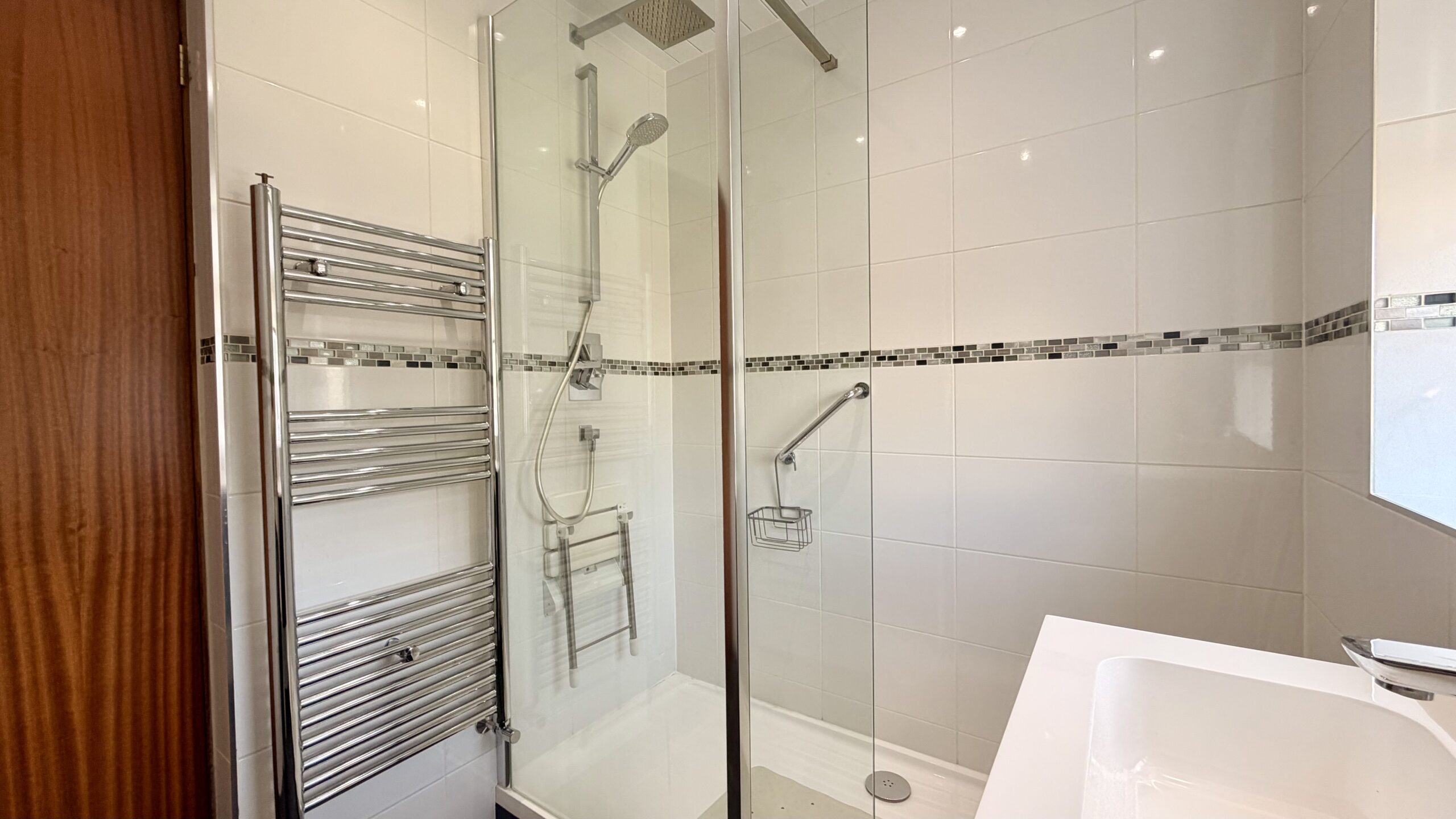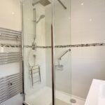 Newly fitted, modern three piece sanitary suite with window to rear, recess lighting, heated towel rail, vanity storage, tiled flooring and double shower cubicle with rainfall power shower. Access to inner hallway.
