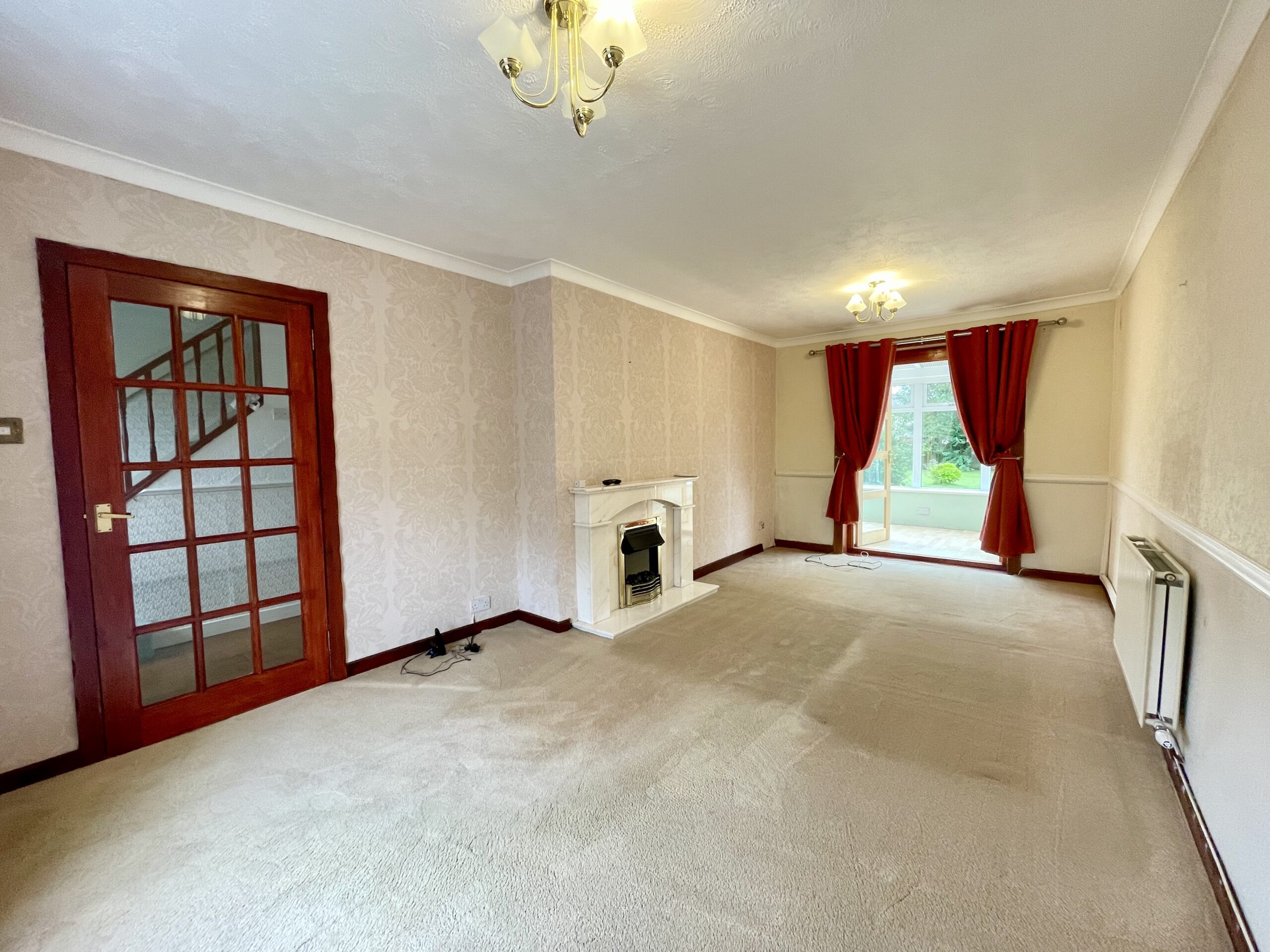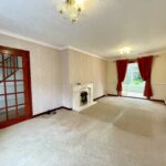 A spacious lounge with window to the front and French doors giving access to conservatory, carpeted flooring, electric fire with fireplace and door accessing inner hallway.