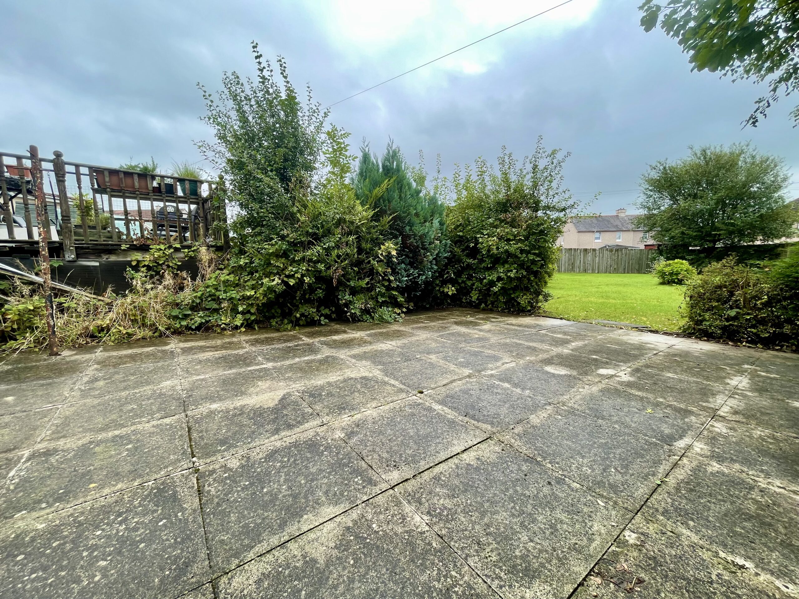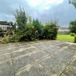 Substantial enclosed rear garden is mainly laid to lawn with paving, shrubs and trees.