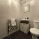 Shower cubicle with power shower, feature lighting, heated towel rail, vanity unit and tiled flooring. Access to bedroom.