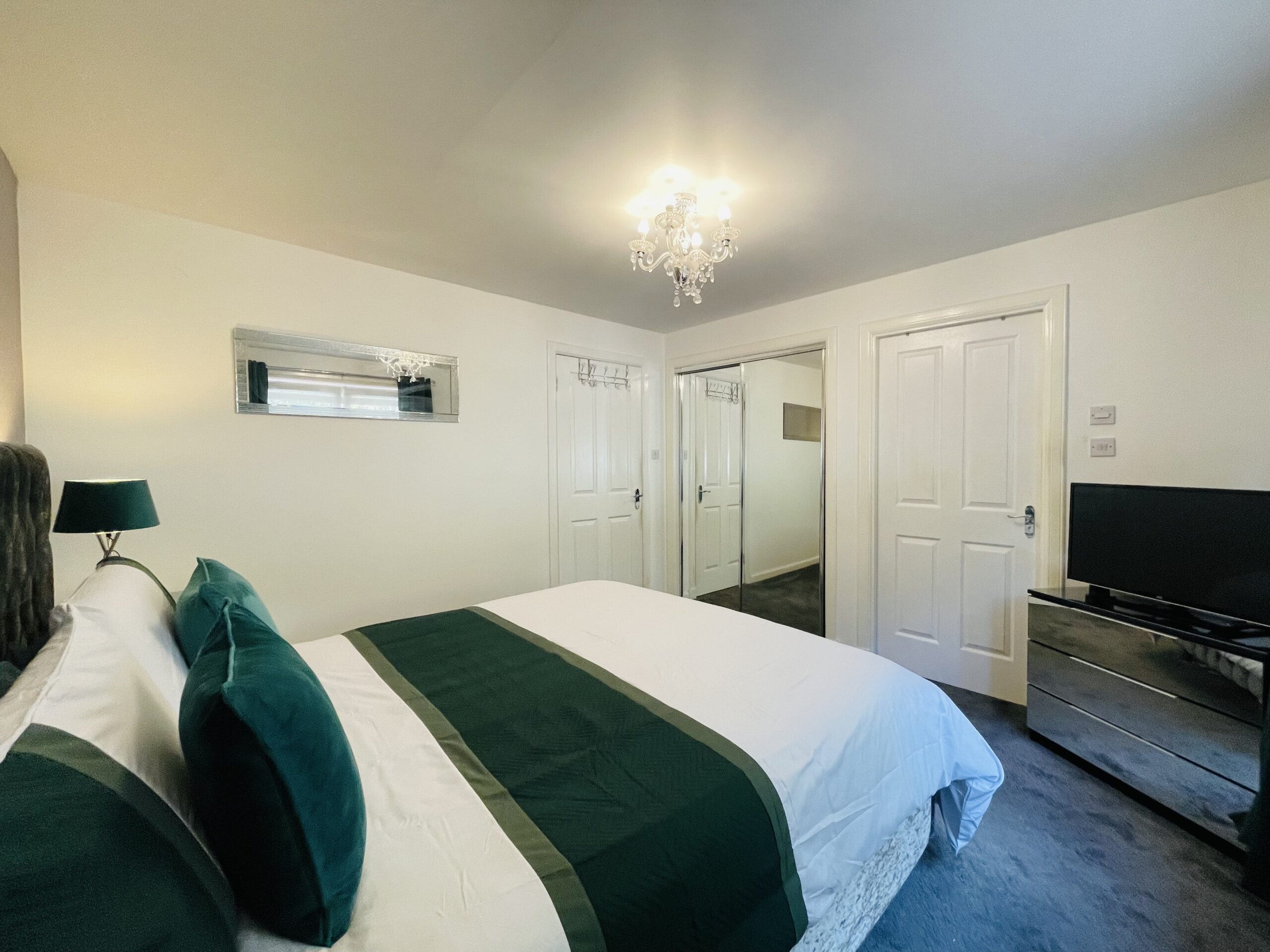 Spacious master bedroom with window to the rear, feature lighting, carpeted flooring, double fitted mirrored wardrobes, access to master en-suite and inner hallway.