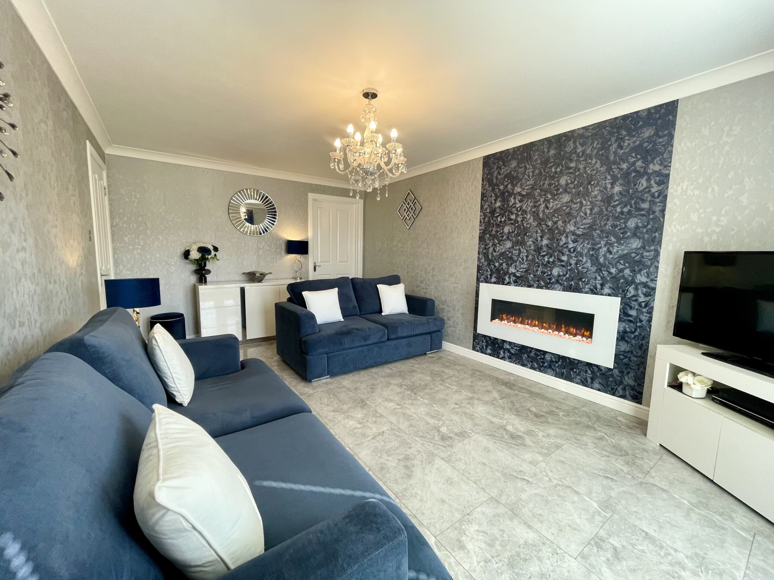 Bright and spacious lounge benefits from many attractive features including French doors with Juliet balcony allowing bright natural light, feature lighting, LVT flooring and electric wall fire. Access to dining kitchen and inner hallway.