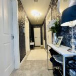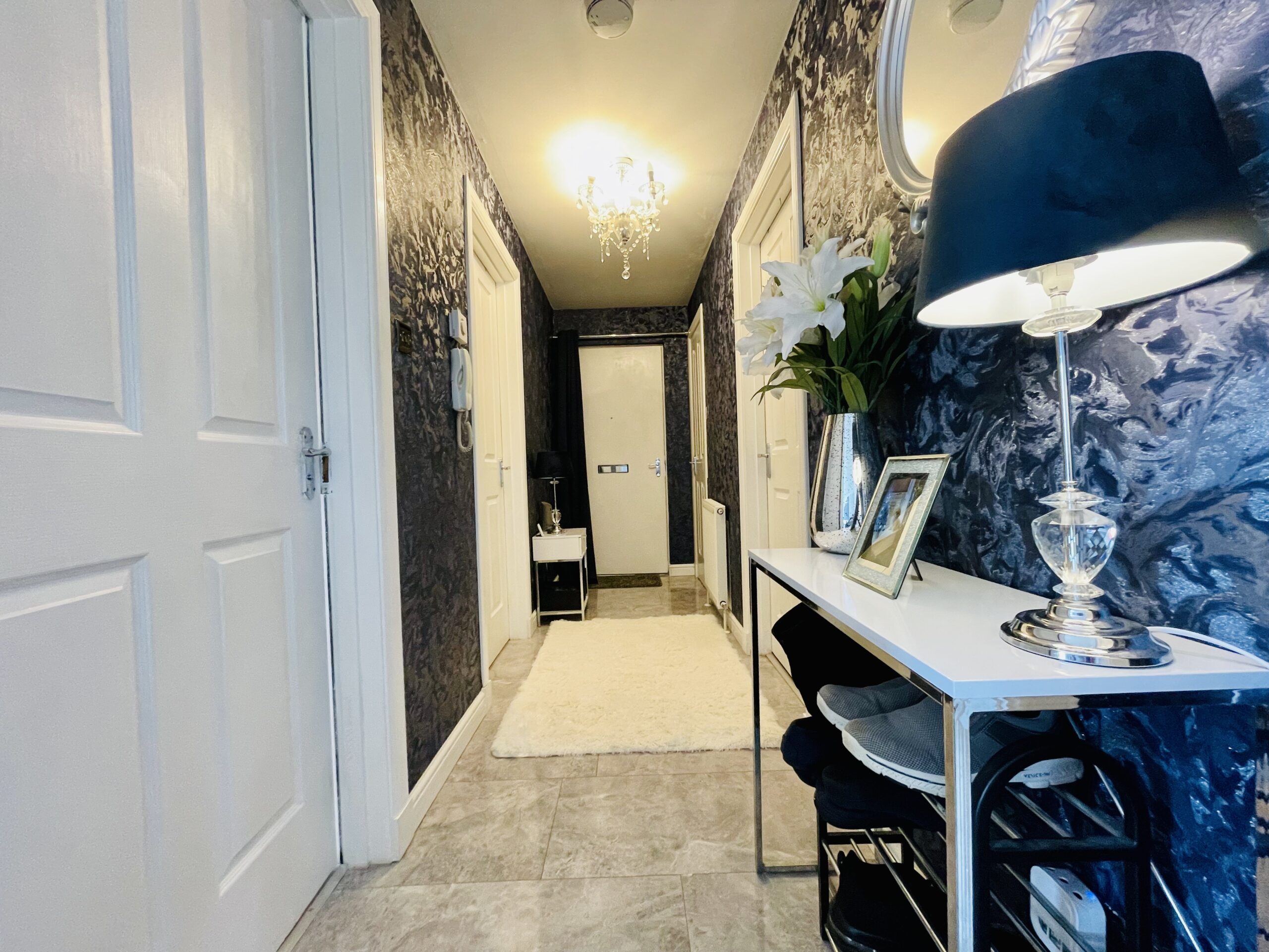 Open welcoming hallway with LVT flooring, feature lighting and storage cupboard. Access to two double bedrooms, bathroom and lounge.