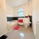 Three piece white sanitary suite with tiled flooring, feature lighting, vanity storage and window to rear. Access to inner hallway.
