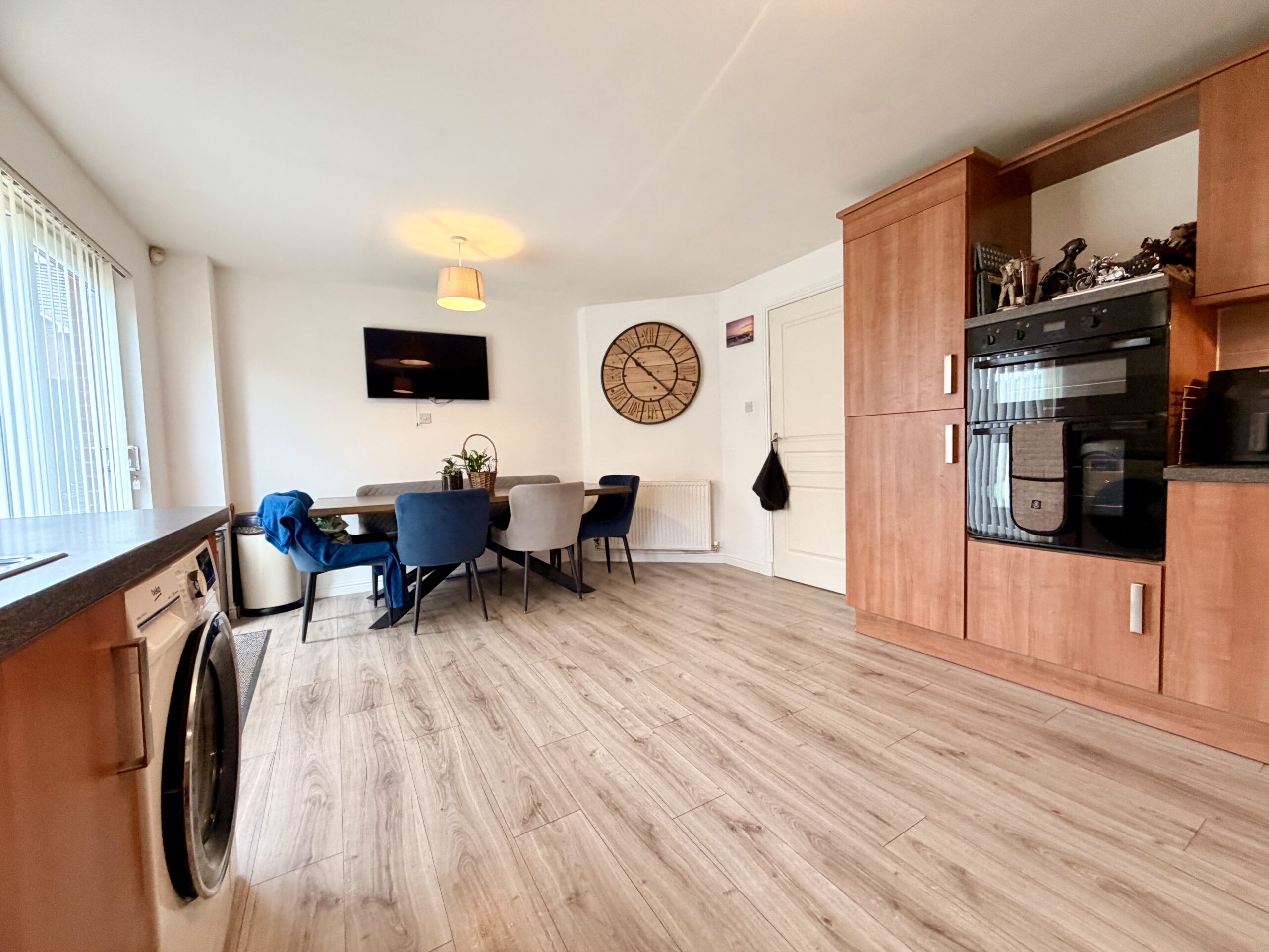 A spacious and bright dining kitchen with ample floor/wall units and contrasting worktops containing sink with mixer tap. Integrated appliances including gas hob, electric oven with integrated extractor fan, integrated fridge, freezer dishwasher, feature lighting and laminate flooring. Window to rear, Patio sliding doors accessing rear patio and gardens. Door accessing inner hallway.