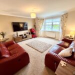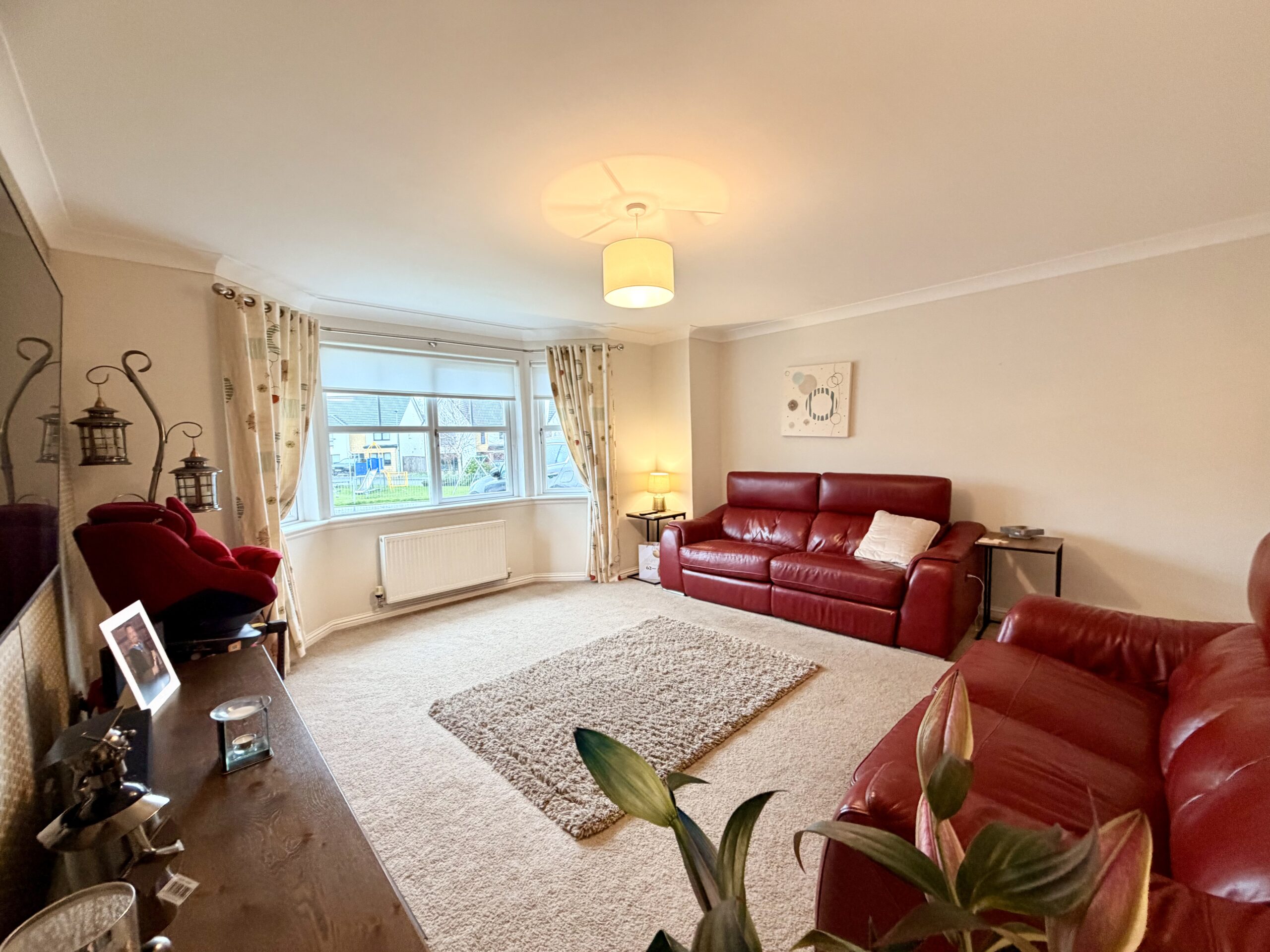 A welcoming family lounge with bay feature window to the front of the property flooding this room with natural light and overlooking landscaped gardens, carpeted flooring and feature lighting. Access to inner hallway.