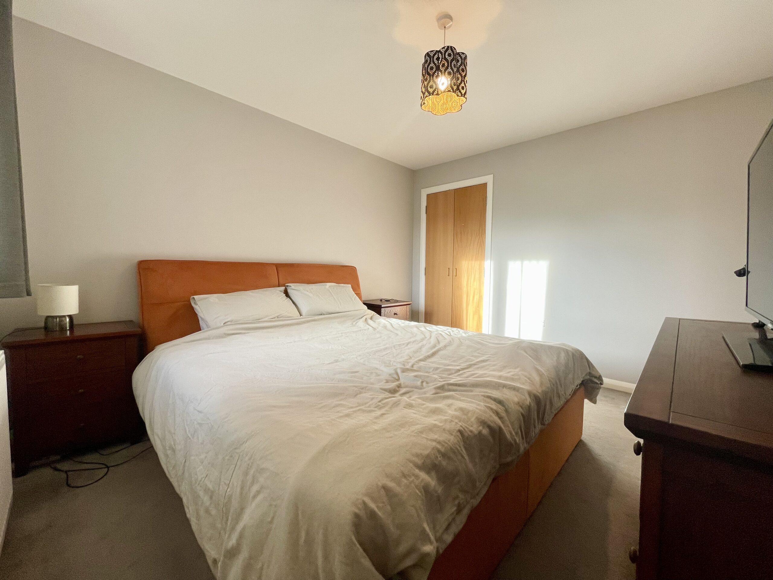Window to front, carpeted flooring, 'His & Hers double fitted wardrobes, storage cupboard and feature lighting. Access to inner hallway.