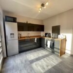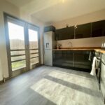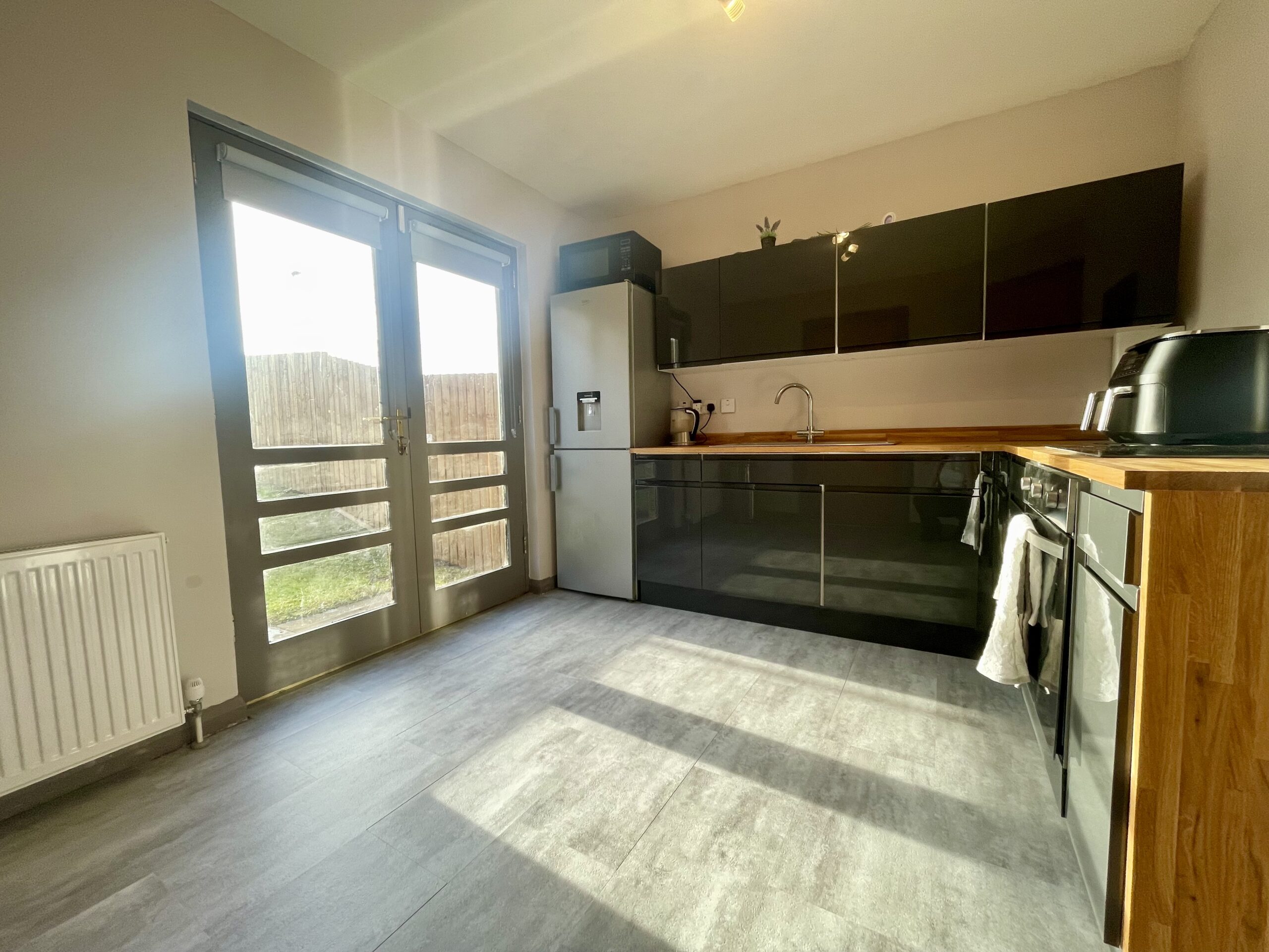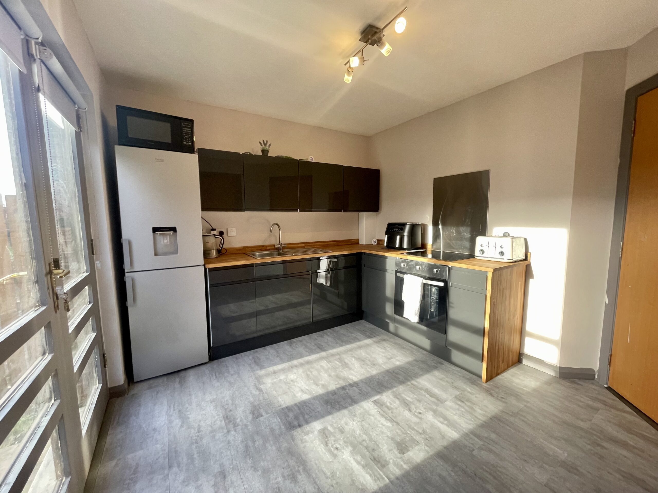 Modern fitted kitchen with ample floor and wall units, contrasting worktops, electric hob and electric oven, sink with mixer tap, laminate flooring and feature lighting, French doors to rear accessing private gardens. Access to inner hallway and utility room.