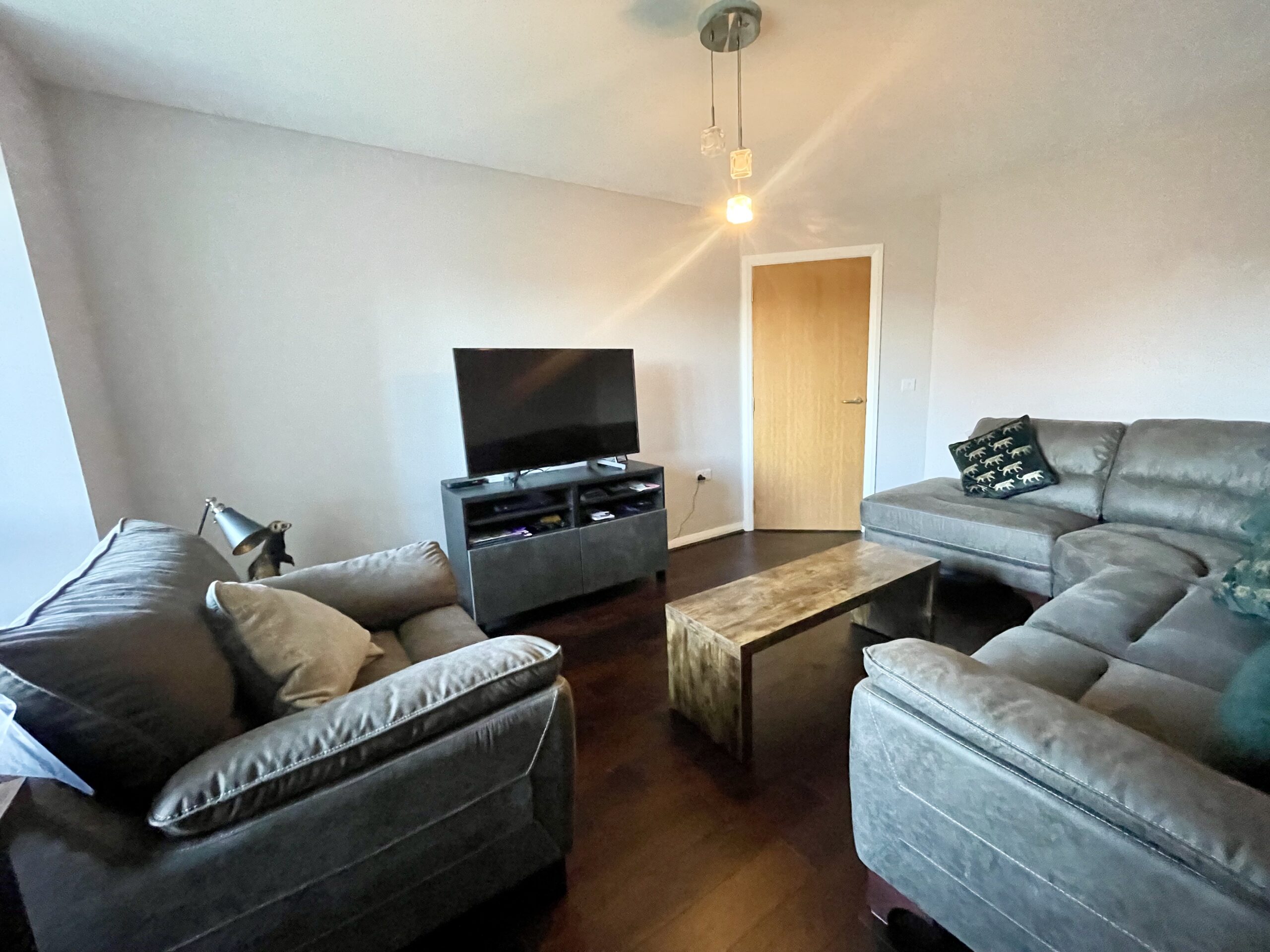 Spacious lounge with bay window to front, real wood flooring and feature lighting. Access to inner hallway.