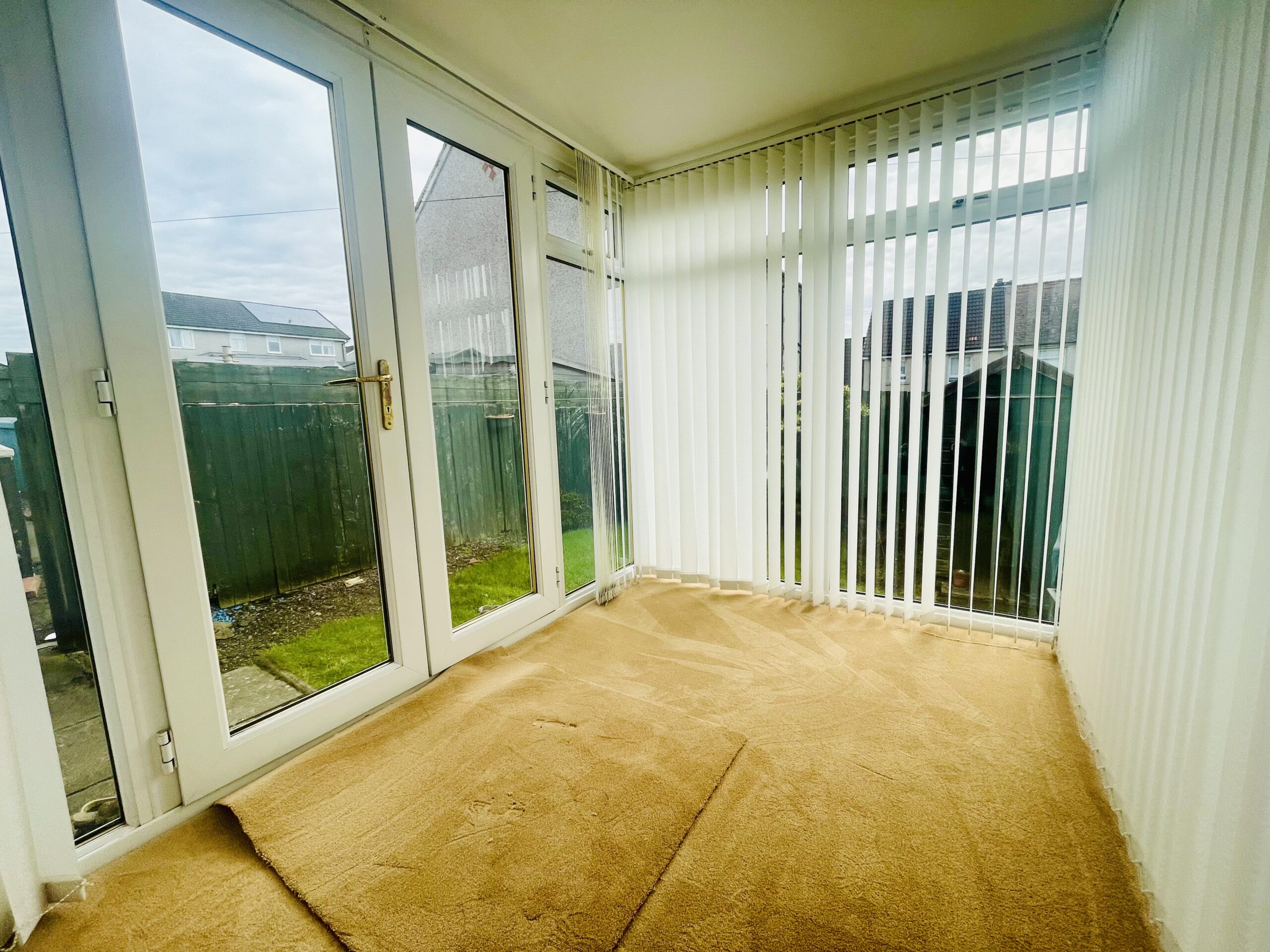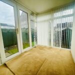 Dwarf glass with French doors accessing rear garden and carpeted flooring. Access to dining kitchen.